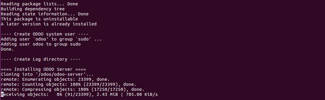 Now you can wait for 2-3 minutes for the completion of script execution. Odoo has to be cloned and the dependency packages have to be installed.